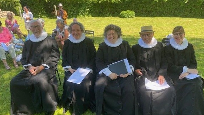 I år er der fælles 2. pinsedagsgudstjeneste udenfor præstegårdshaven i Skovby. Kløverbladets præster deltager, og korene synger sammen.