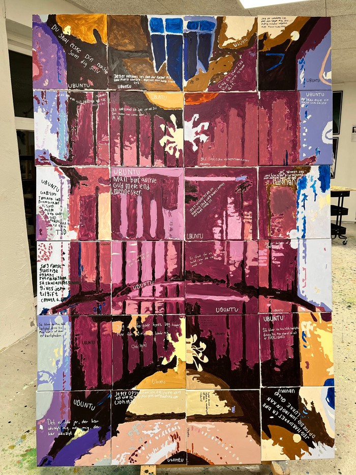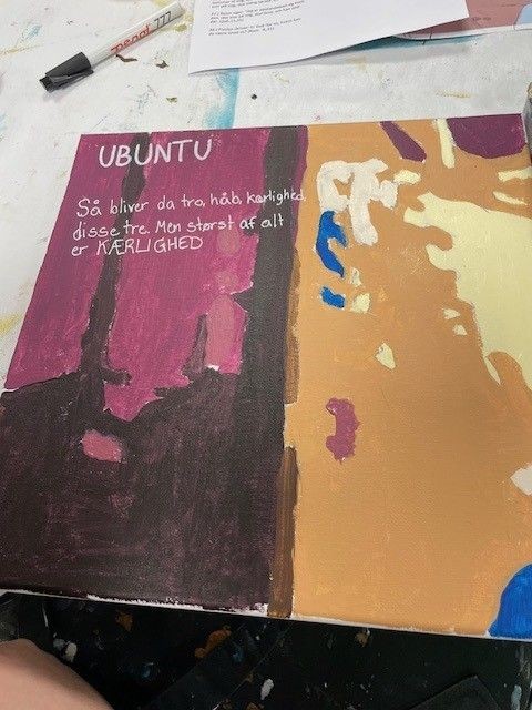På maleriet har de både skrevet et selvvalgt skriftord og et gammelt afrikansk udtryk: Ubuntu, som betyder: “Jeg er, fordi vi er.”